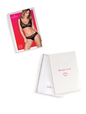Fantastico set in due pezzi: reggiseno con ferretto e coppe imbottite per un perfetto look del busto! larghi cinturini in pizzo si trasformano in coppe; spalline regolabili e chiusura multistadio sul; retro materiale beige nelle tazze – bellissimo ornamento pizzo sotto il seno per una linea accentuata del busto, perizoma in pizzo e inserto beige sul davanti; derriere ornato con ampio pizzo