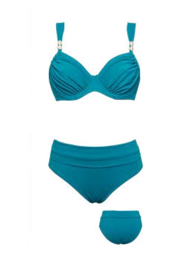 Bikini composto da reggiseno francese con arriccio, ferretto e doppia allacciatura abbinato a slip doppia vestibilità,fianco 16/10 cm. Costume realizzato con tessuto scintillante impreziosito da gocce di perle