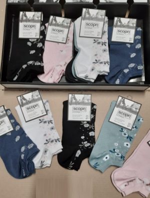 Calza corta ricamata smollata realizzata in cotone mercerizzato ed in taglia unica 35-40Composizione 80% cotone 18% poliestere 2% elastanConfezione da 12 paia assortite nei coloriOrdine minim o 12 e multipli