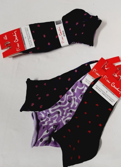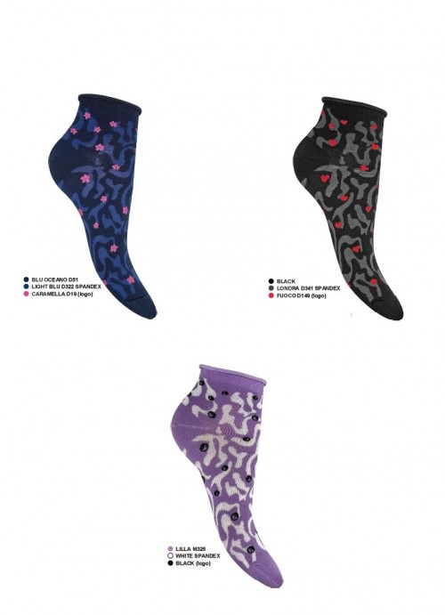 Calza corta ricamata realizzata in filo di scozia elasticizzato ed in taglia unica 35-41Composizione 75% cotone 18% poliestere 5% poliammide 2% elastanConfezione da 12 paia assortite nei colo riOrdine minimo 12 e multipli