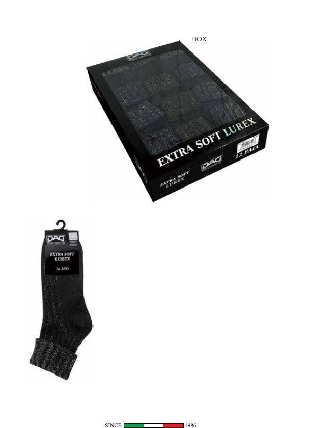 Calza soft con risvolto in lurex. Taglia unica 35-41. Box assortito nei colori lurex silver con 8 paia e lurex gold con 4 paia