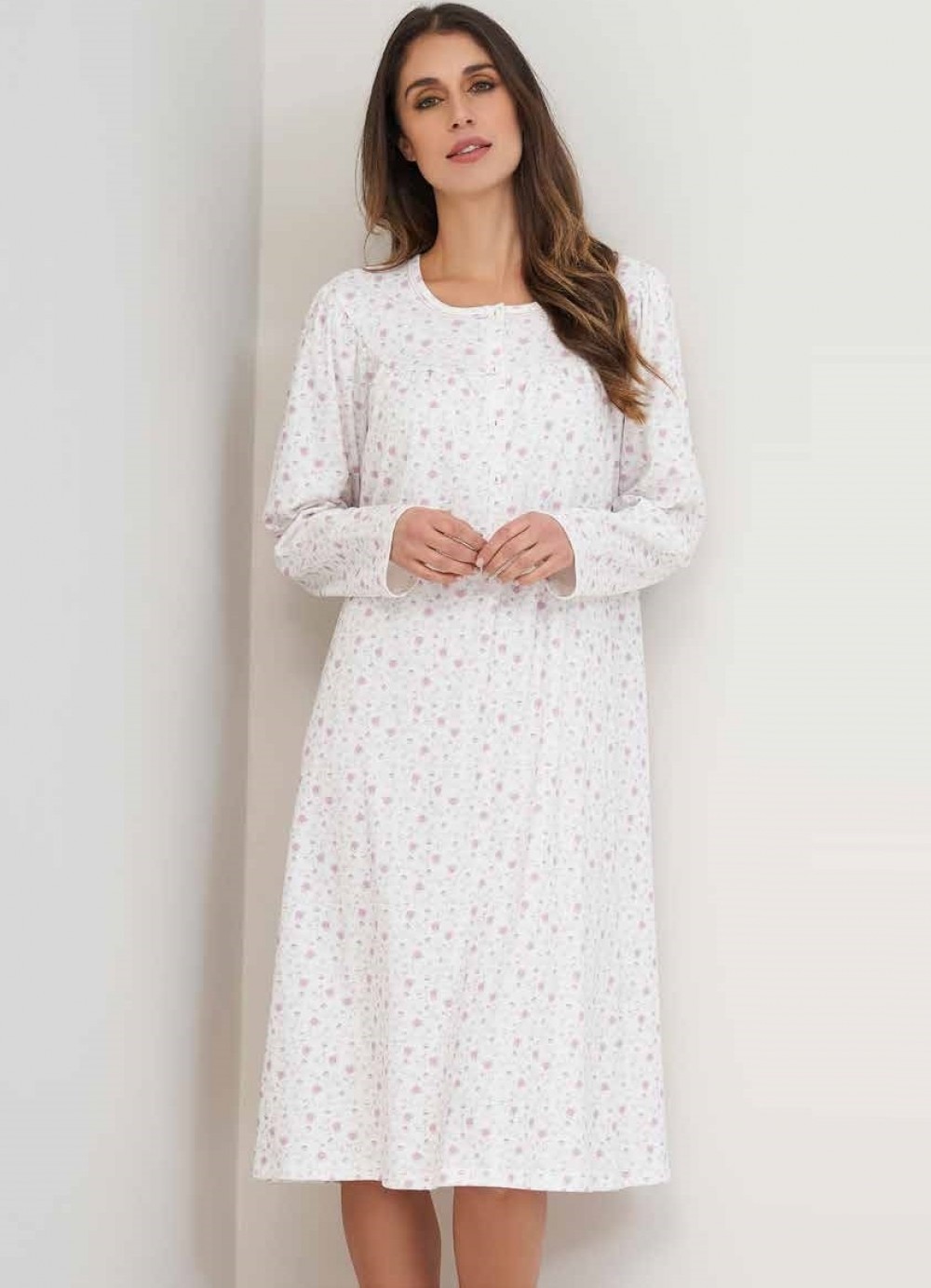 Camicia da notte realizzata in interlock di cotone stampato con scollo serafino e maniche raglan