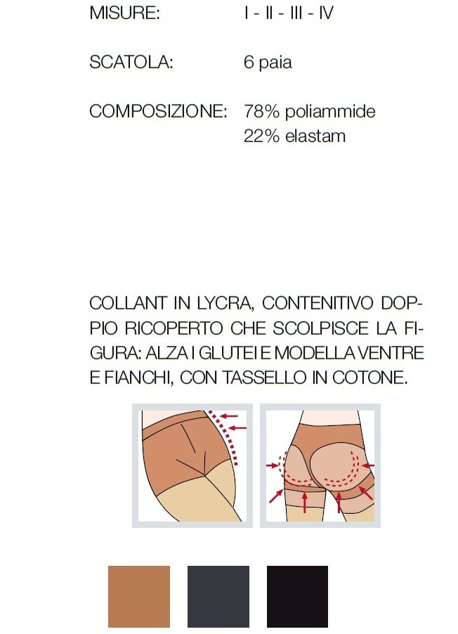 Collant in lycra, contenitivo doppio ricoperto che scolpisce la figura: alza i glutei e modella ventre e fianchi. Tassello in cotone.