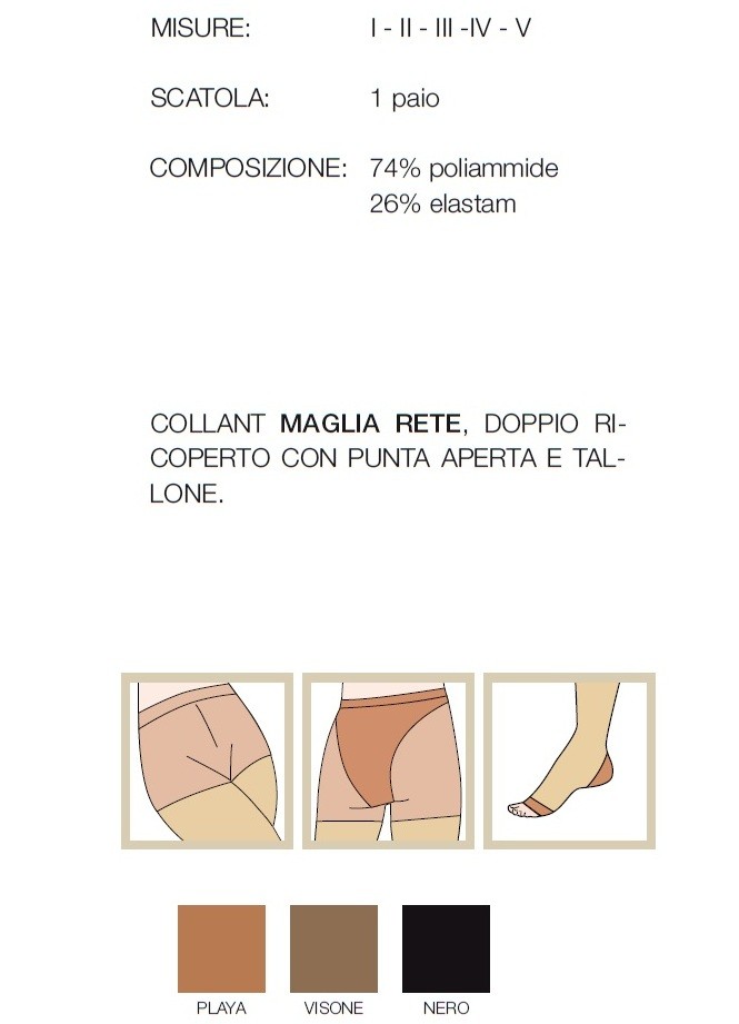 Collant in lycra maglia a rete, doppio ricoperto, con punta, soletta e tallone. Compressione forte (mmHg 15/18). Calza/collant a compressione graduata, riposante, modellante, preventiva ad azione contenitiva.