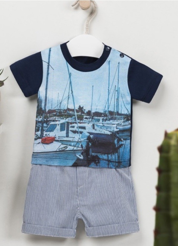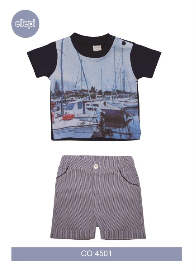 Completo composto t.shirt in cotone con stampa centrale e pantalone in tela rigata tinto filo