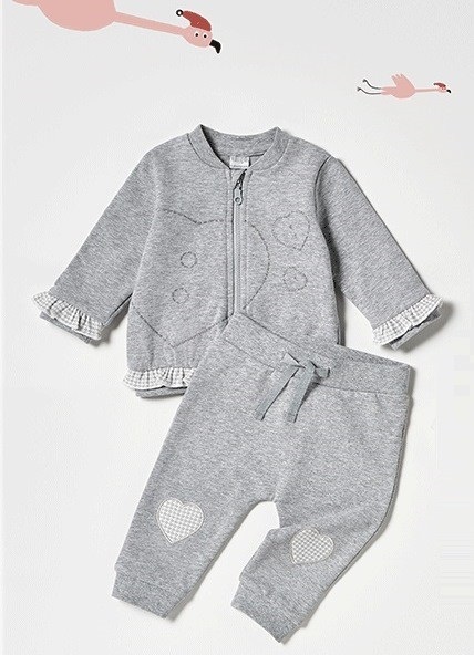 Completo realizzato in cotone felpato ricamato e con applicazioni, composto da maglia full zip e pantalone con coulisse