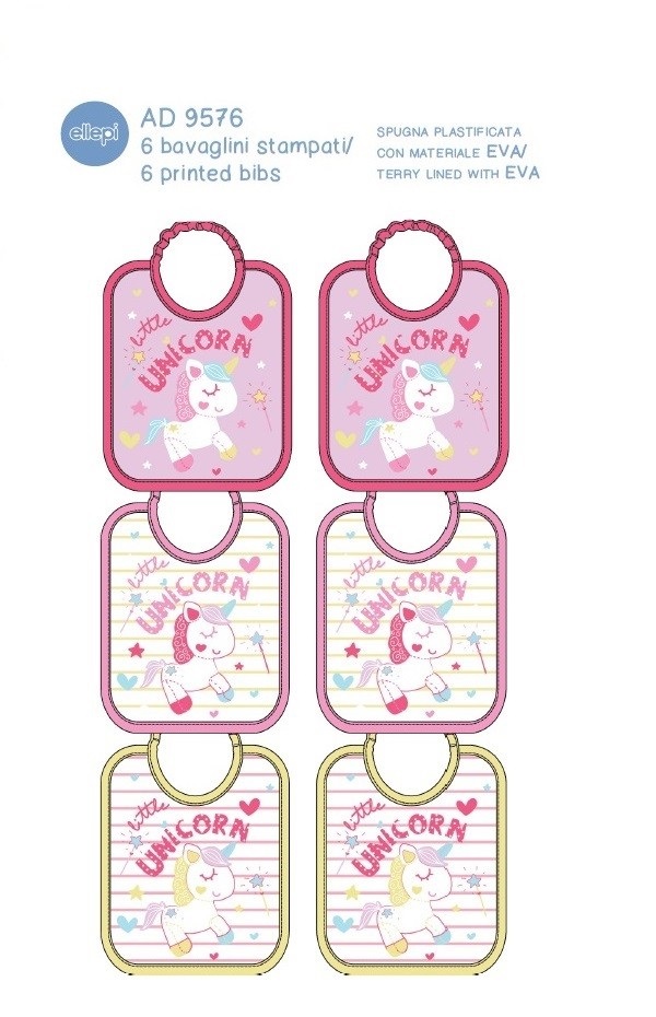 Confezione da 6 bavaglini in spugna plastificata con materiale EVA stampata