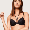 Completo realizzato in pizzo e microfibra composto da reggiseno push-up con coppe graduate e collarino estraibile con strass abbinato a brasiliana