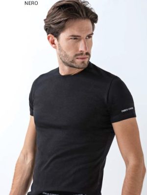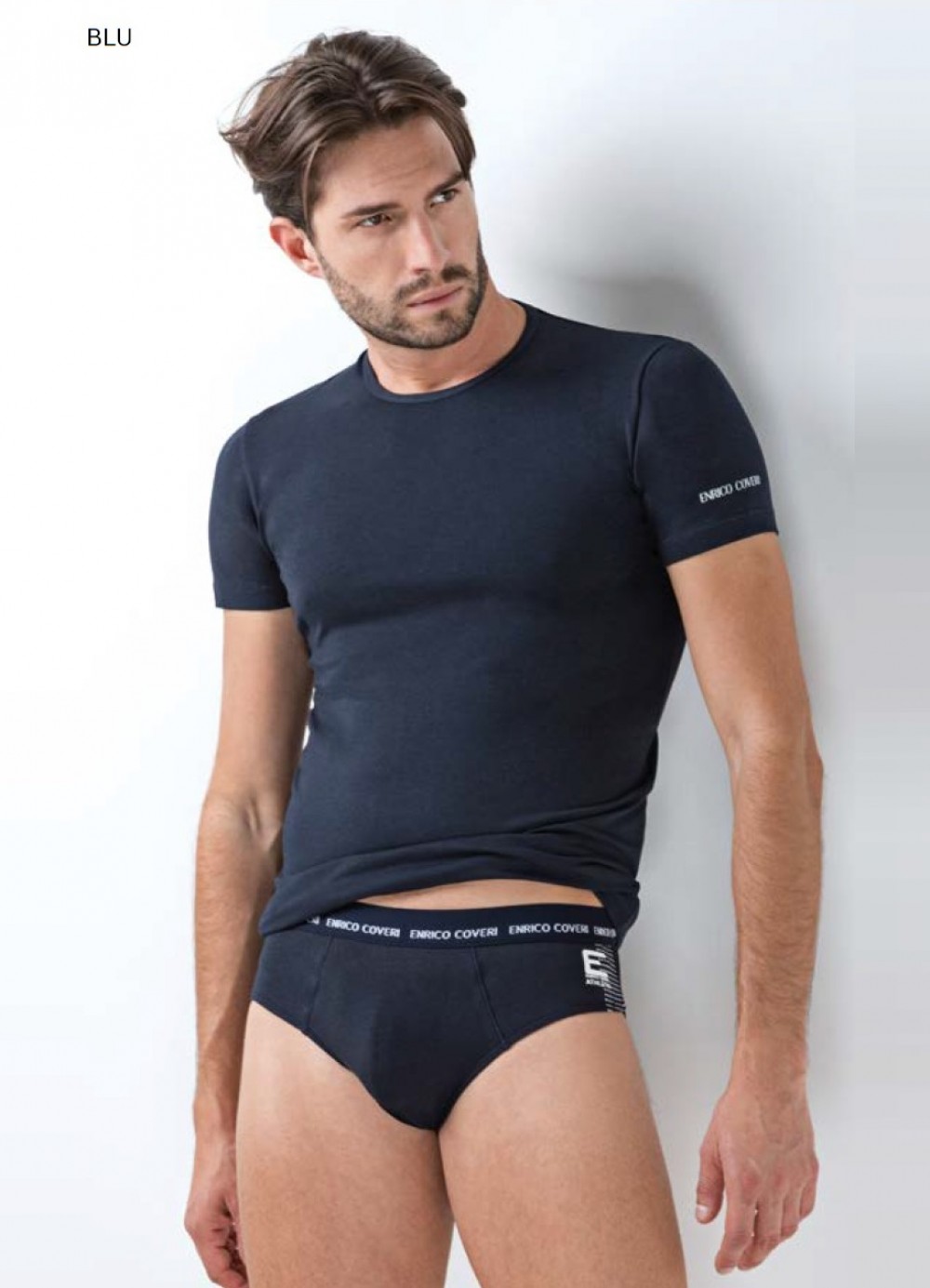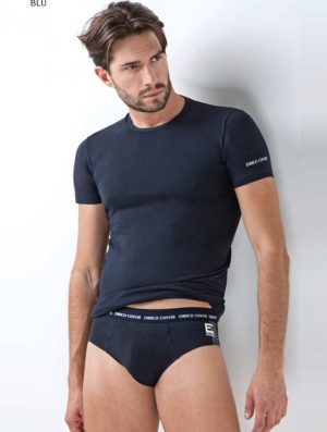 Completo realizzato in cotone elasticizzato composto da maglia mezze maniche e scollo a giro abbinata a slip con elastico parlato