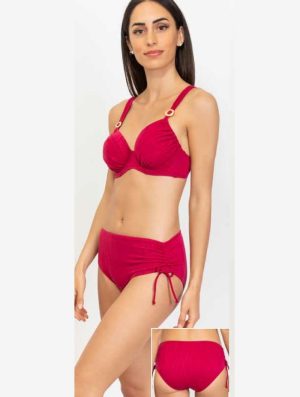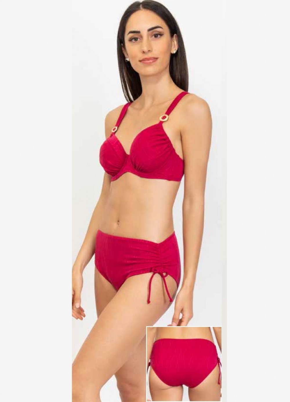 Bikini composto da Reggiseno francese con arriccio e ferretto, doppia allacciatura e spalline regolabili abbinato a Slip con arriccio, fianco 11 cm