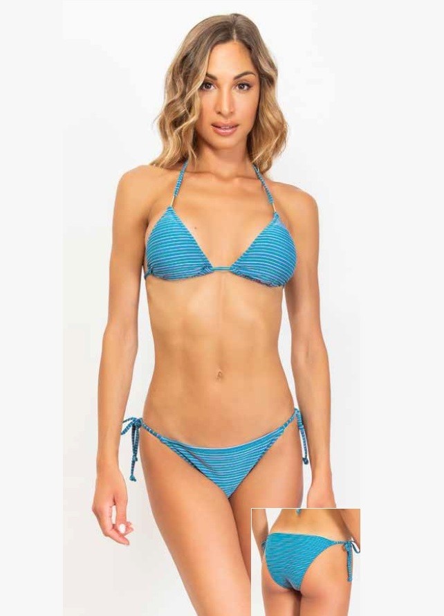 Bikini composto da reggiseno a triangolo tendina con coppe estraibili abbinato a tanga con laccetti