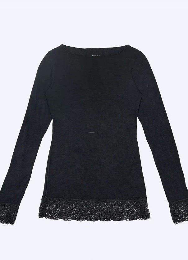 Maglia a manica lunga, scollo a barca con inserti in pizzo sul fondo e sui polsi. Maglia total black realizzata in modal con fibra in cashmere, perfetta come sottogiacca, dona un tocco chic e raffinato. Tessuto che conferisce un piacevole effetto second skin e trattiene il calore durante le giornate più fredde