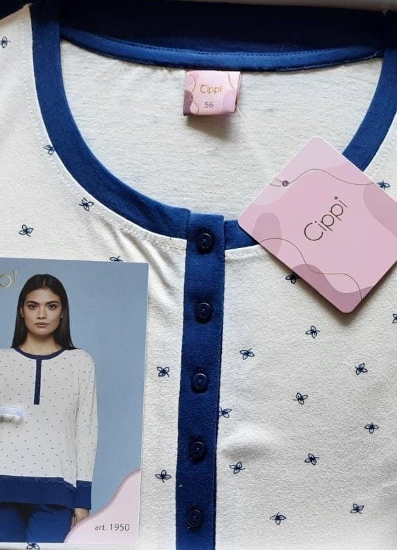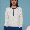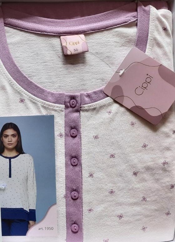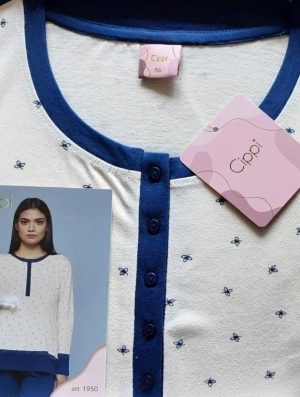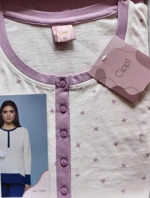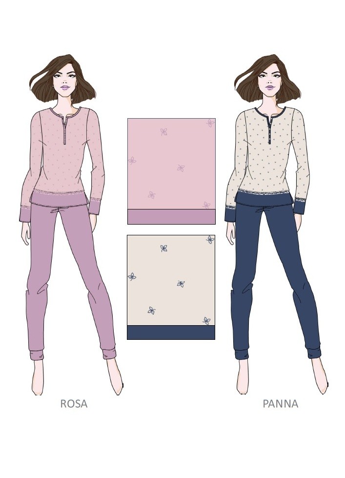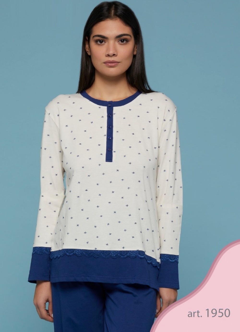 Pigiama lungo realizzato in jersey di cotone BIO washing, composto da maglia a fantasia con taschino e scollo serafino abbinata a pantalone unito con polsino