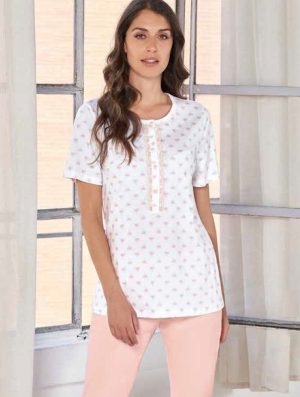 Pigiama lungo realizzato in jersey stampato, composto da maglia a MANICHE LUNGHE e a fantasia con scollo serafino abbinata a pantalone lineare a tinta unita
