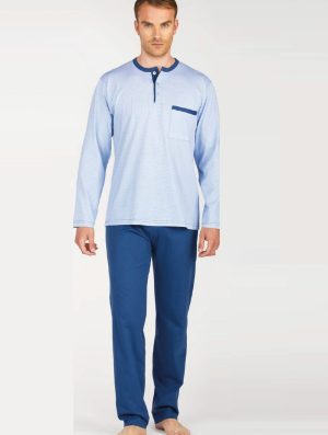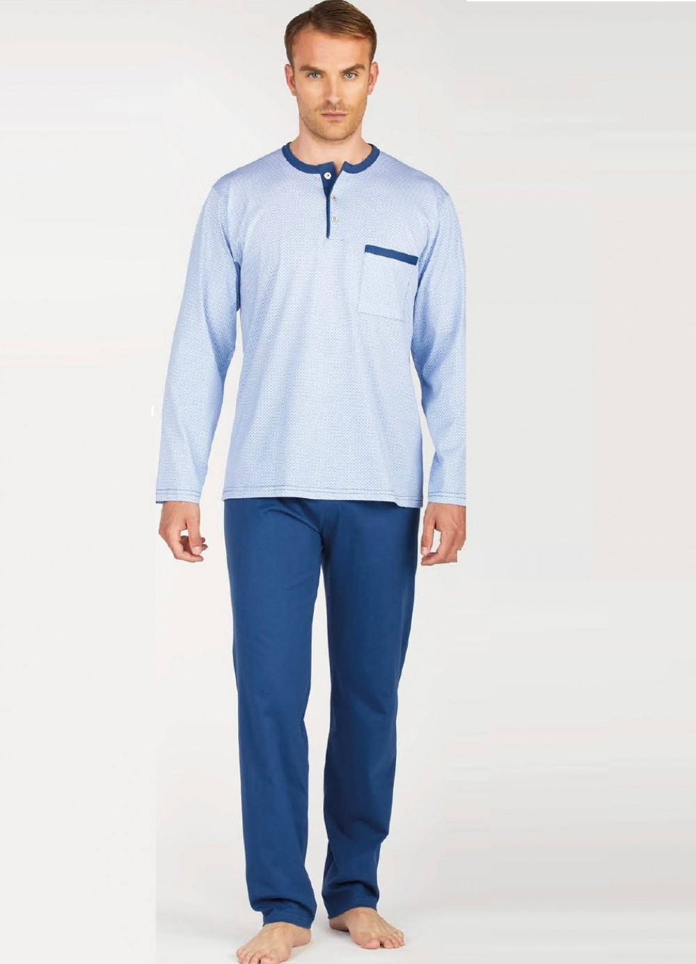 Pigiama lungo realizzato in cotone pettinato composto da maglia a fantasia con scollo serafino abbinata a pantalone lineare a tinta unita