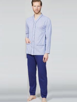 Pigiama realizzato in cotone pettinato composto da maglia aperta in micro fantasia e pantalone lineare a tinta unitaComposizione 100% cotone