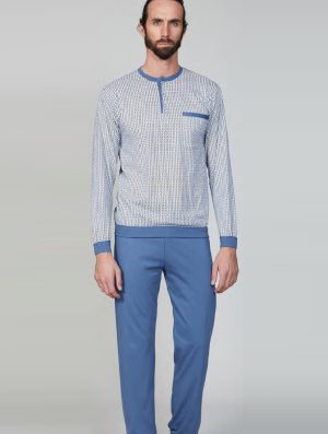 Pigiama calibrato realizzato in cotone pettinato, a fantasia per la maglia con scollo serafino a tre bottoni ed unito per il pantalone con polsiniComposizione 100% cotone
