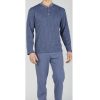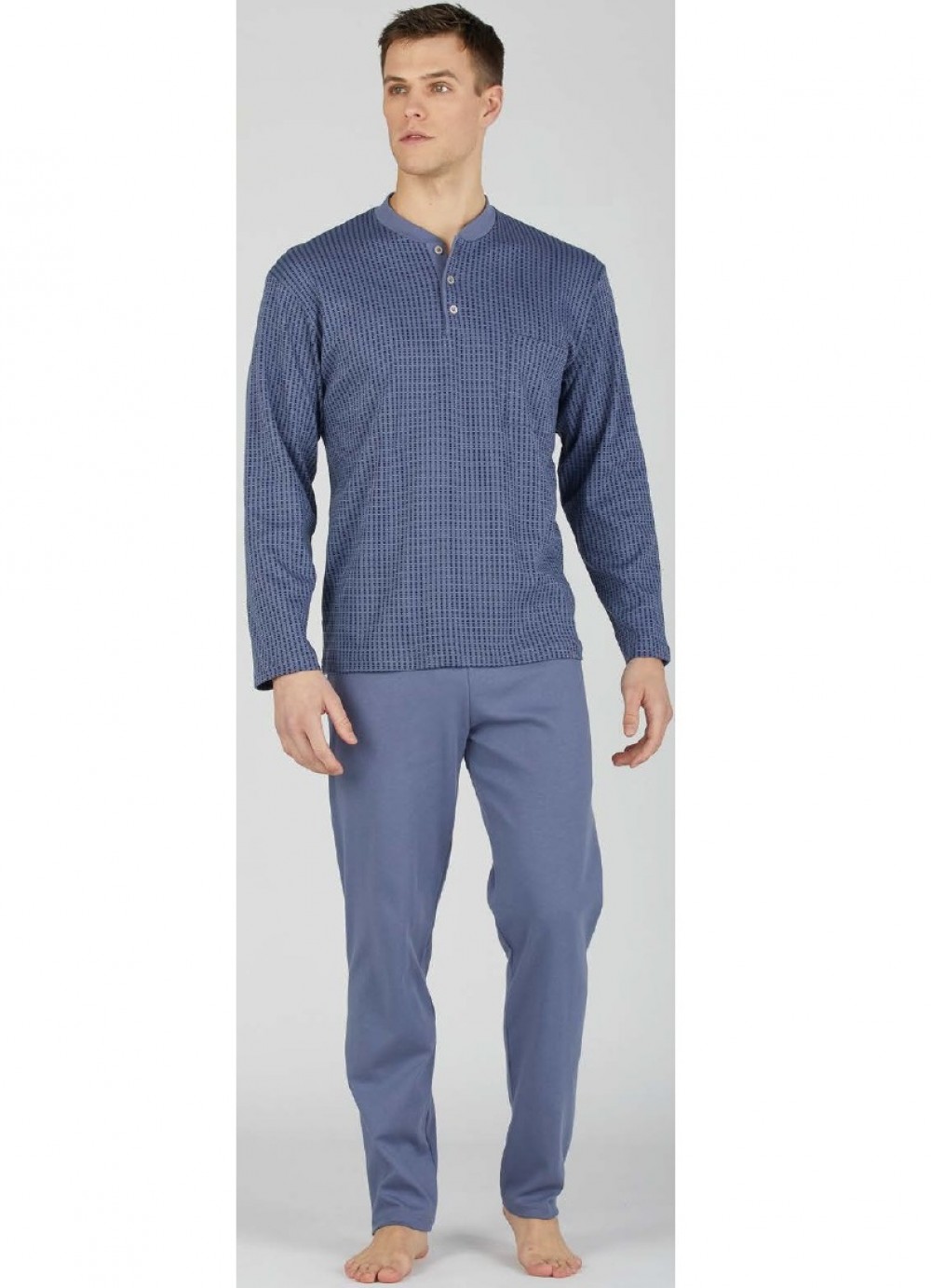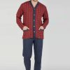 Pigiama realizzato in cotone pettinato composto da maglia con scollo serafino a fantasia abbinata a pantalone unito e lineare