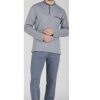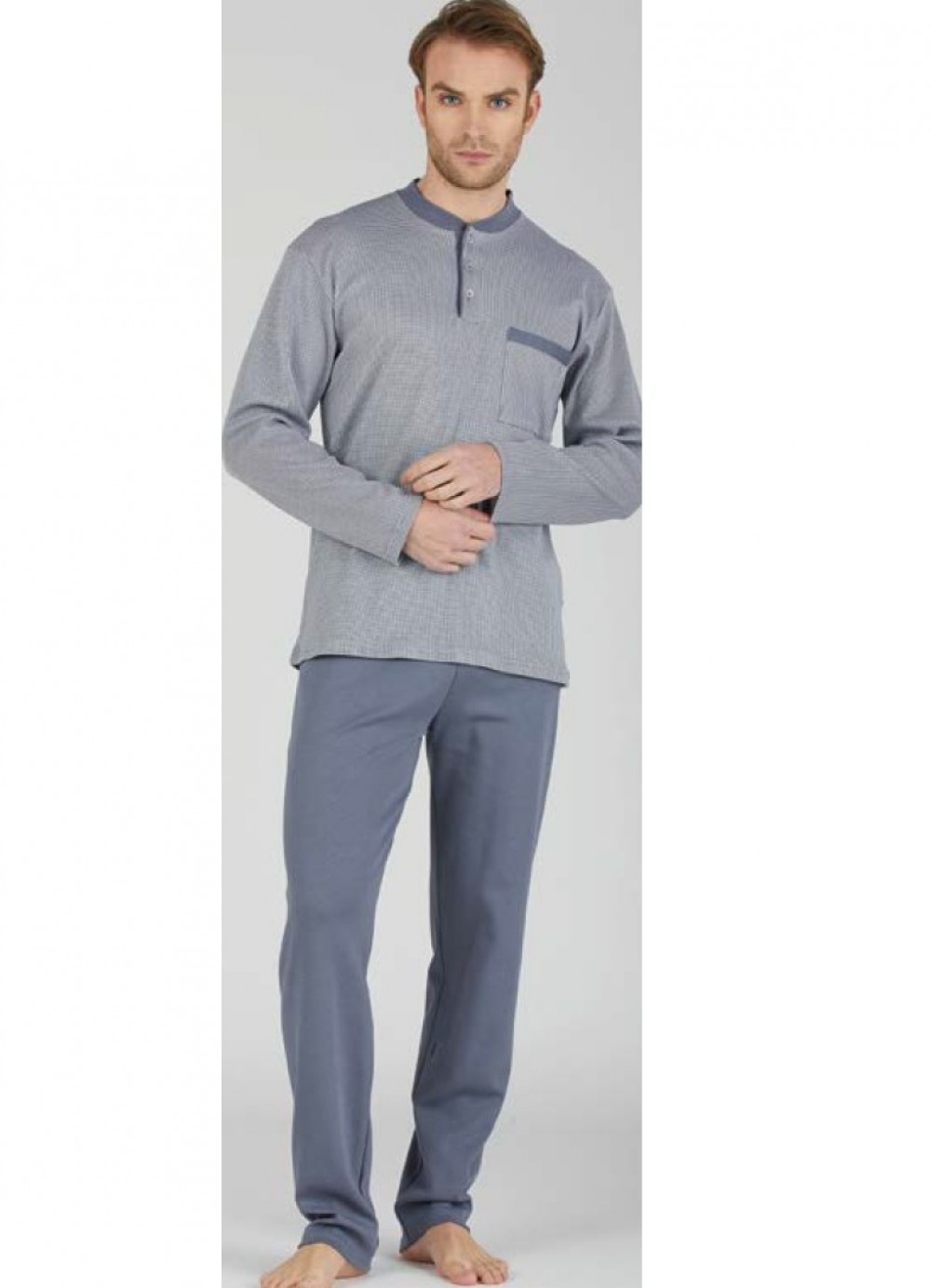 Pigiama realizzato in cotone pettinato composto da maglia con scollo serafino a fantasia abbinata a pantalone unito e lineare