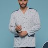 Pigiama realizzato in interlock di cotone pettinato composto a giacca a fantasia e pantalone lineare unito