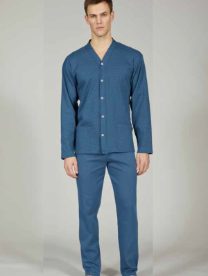 Pigiama realizzato in interlock di cotone pettinato composto a giacca a fantasia e pantalone lineare unito