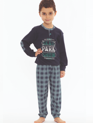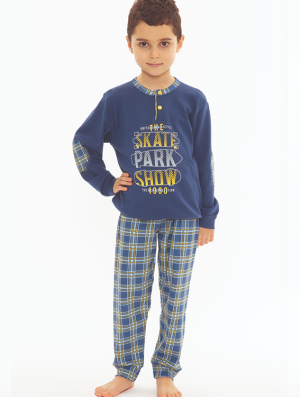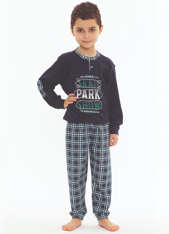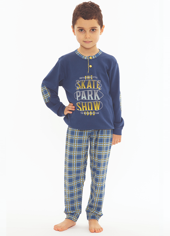Pigiama realizzato in caldo cotone, maglia tinta unita con stampa, toppe ed elastico sotto, pantalone fantasia con bordo in costina