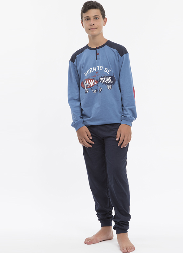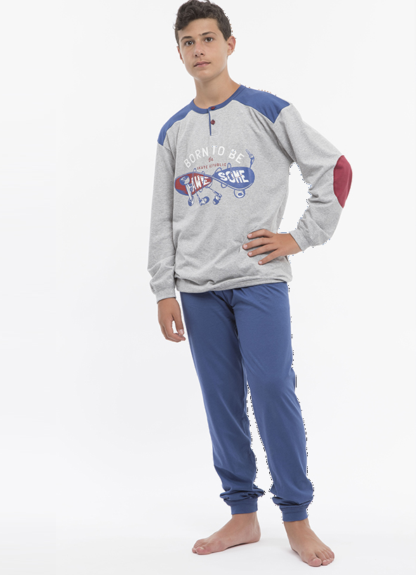 Pigiama lungo composto da maglia tinta unita con stampa, toppe ed elastico sotto, abbinata a pantalone tinta unita con bordo in costina