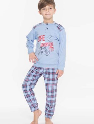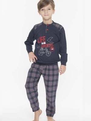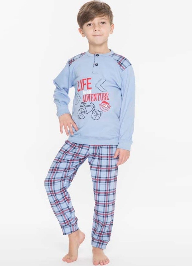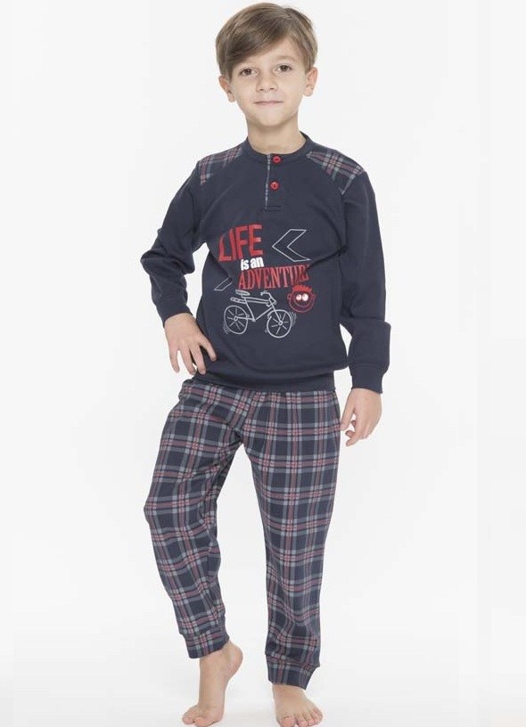 Pigiama realizzato in caldo cotone composto da maglia a tinta unita con stampa ed elastico sotto e pantalone fantasia con bordo in costina