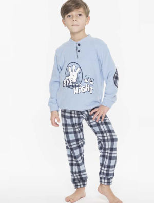 Pigiama realizzato a punto milano composto da maglia a tinta unita con stampa, toppe ed elastico sotto abbinata a pantalone fantasia con bordo in costina