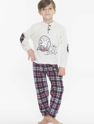 Pigiama realizzato a punto milano composto da maglia a tinta unita con stampa, toppe ed elastico sotto abbinata a pantalone fantasia con bordo in costina