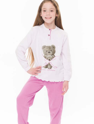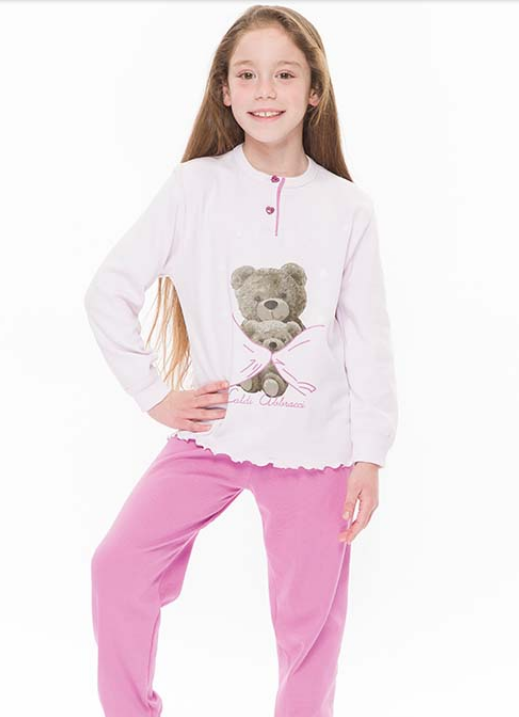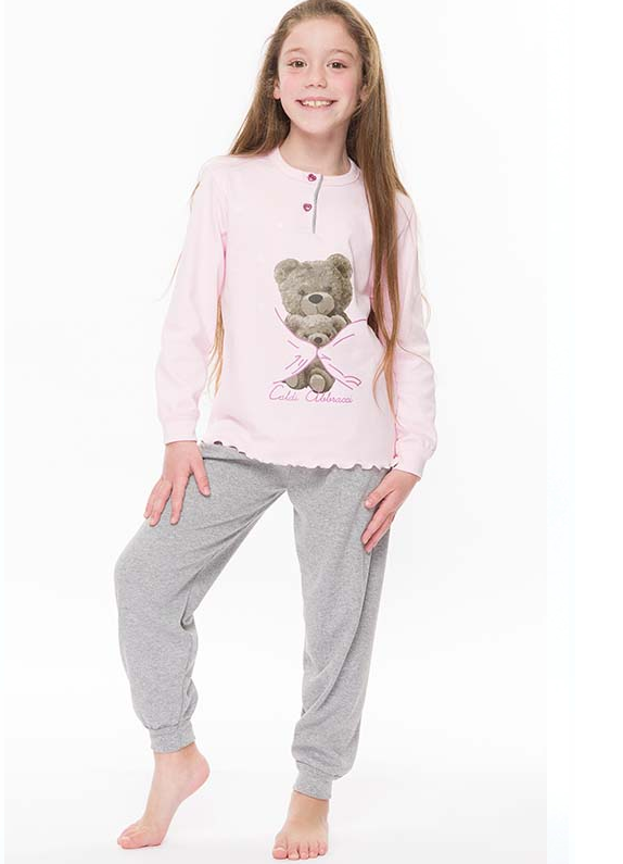 Pigiama realizzato in caldo cotone, composto da maglia a tinta unita con stampa, e pantalone a tinta unita con bordo in costina