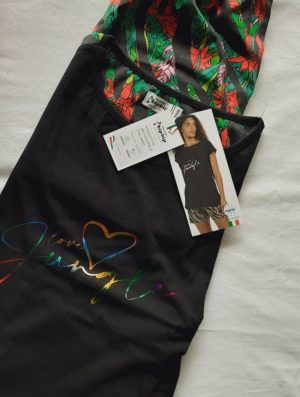 Pigiama corto composto da maglia serigrafata a tinta unita con fianchi a fantasia come il pantaloncino