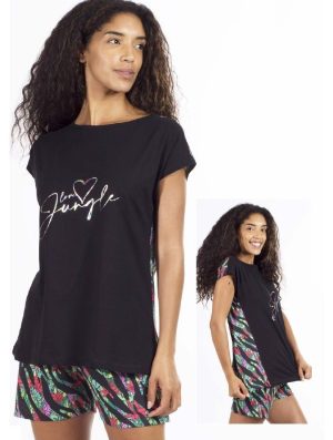 Pigiama corto composto da maglia serigrafata a tinta unita con fianchi a fantasia come il pantaloncino