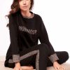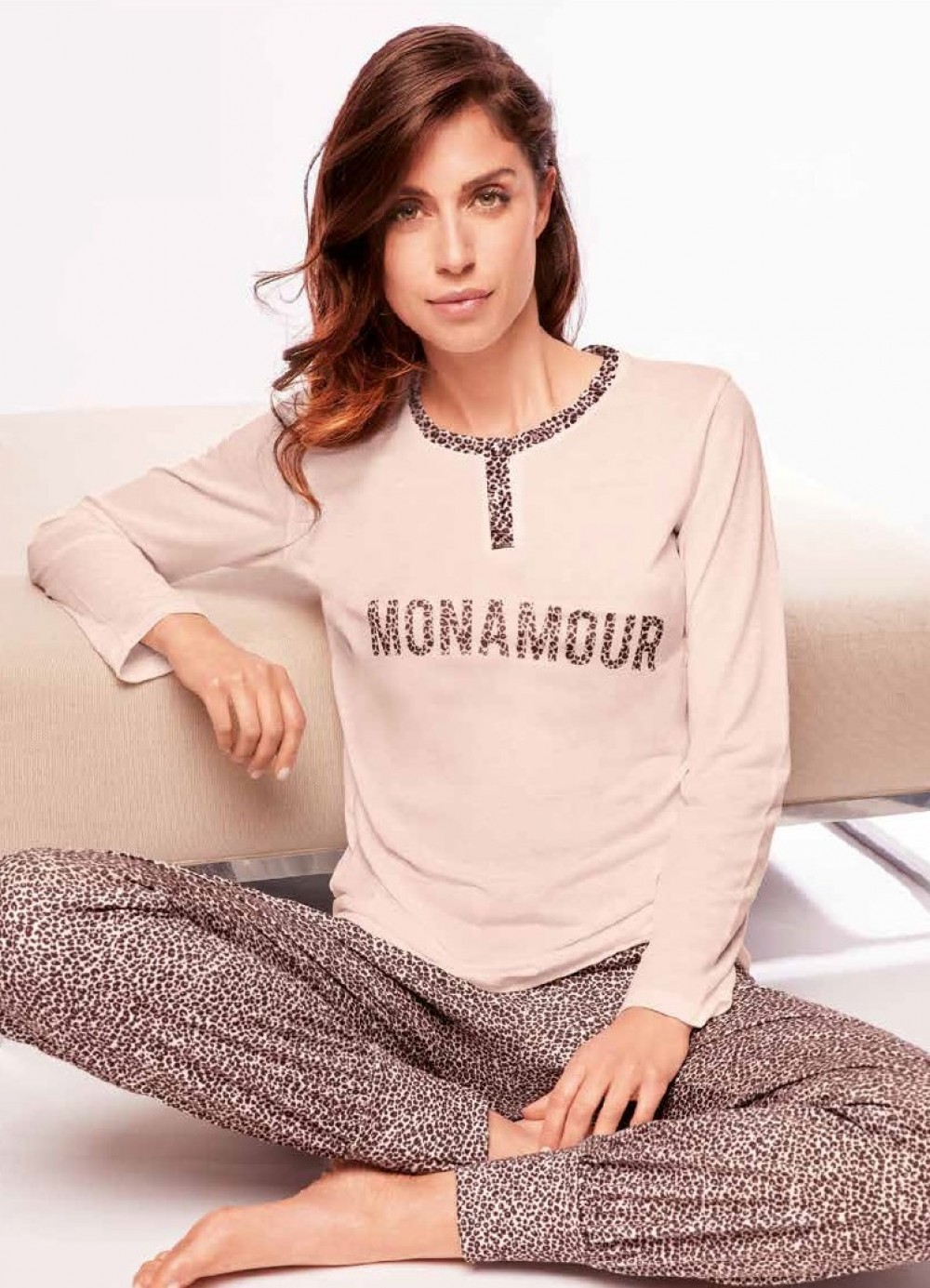 Pigiama lungo composto da maglia a tinta unita con stampa e scollo serafino, abbinata a pantalone a fantasia con polsini