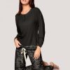Pigiama realizzato in viscosa pesante con stampa pois e pizzo composto da maglia a fantasia con scollo serafino abbinato a pantalone unito e lineare