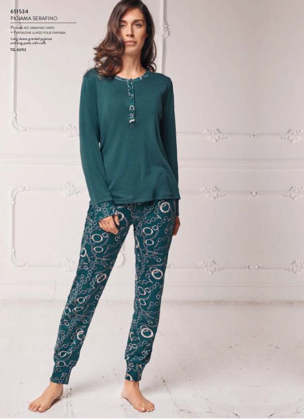 Pigiama lungo realizzai in viscosa pesante, unita per la maglia che presenta scollo seraino, e a fantasia bracciali pinping per il pantalone con polsino alto