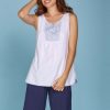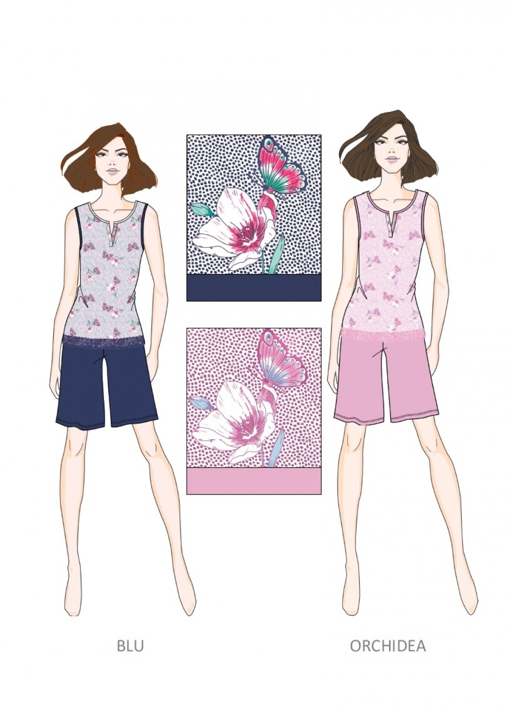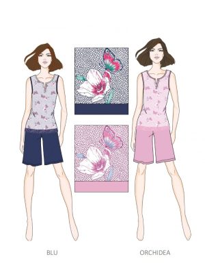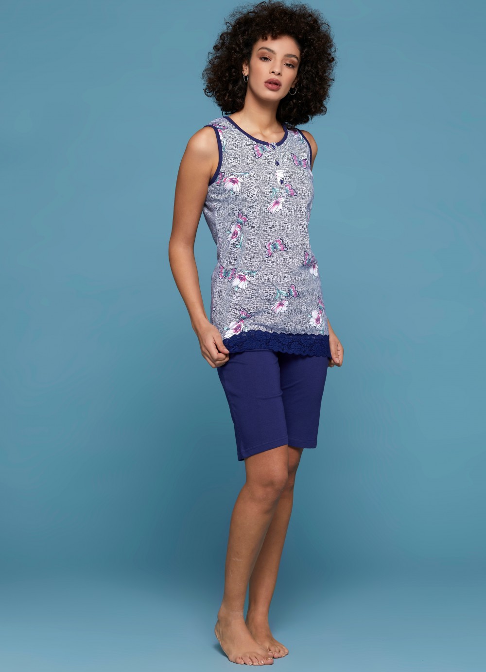 Pigiama corto realizzato in jersey di cotone, composto da canotta a spalla larga stampata e scollo serafino abbinata a pantalone a tinta unita