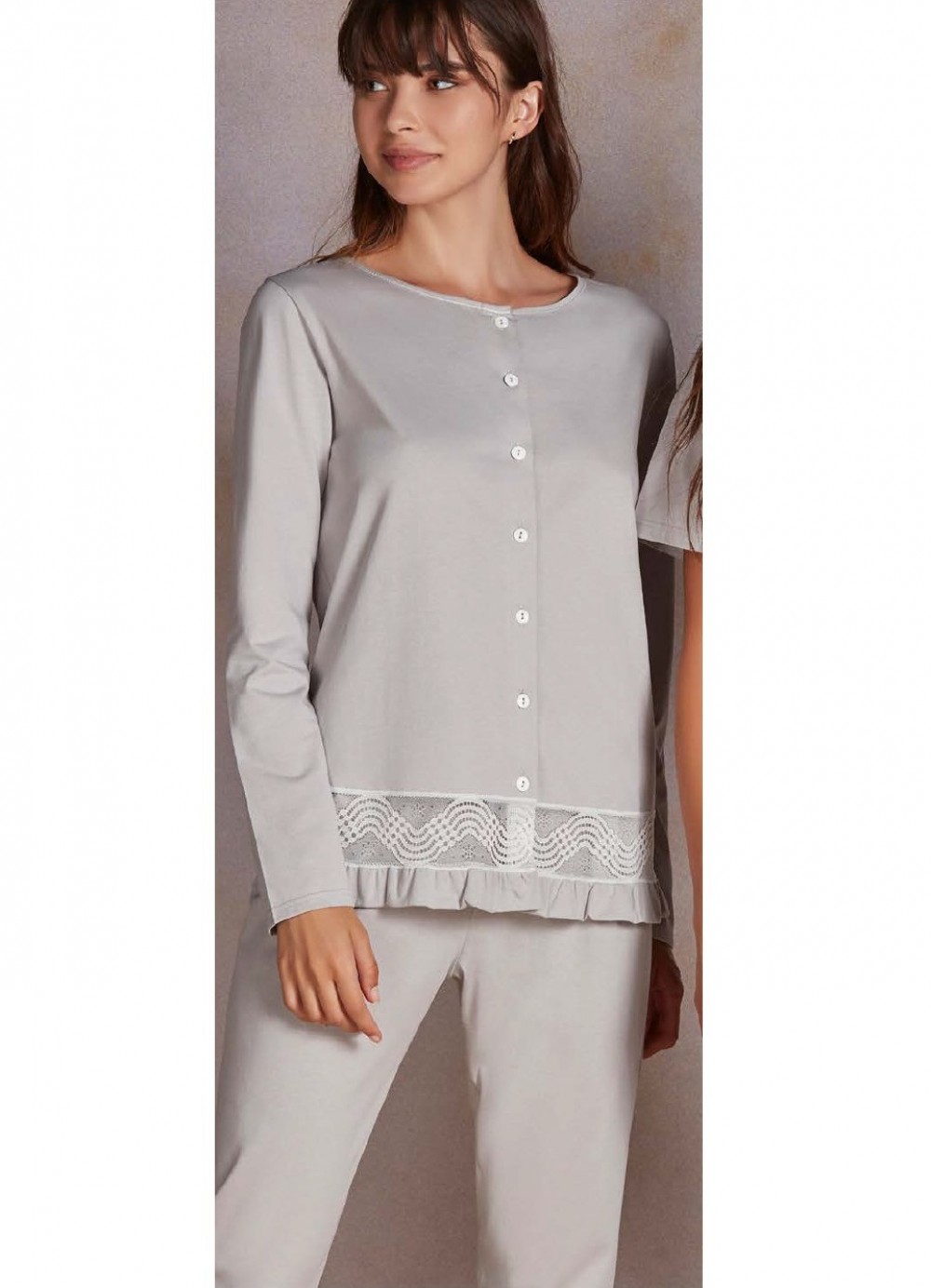 Pigiama lungo realizzato in jersey di cotone e pizzo composto da maglia aperta e pantalone lineare