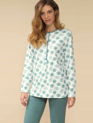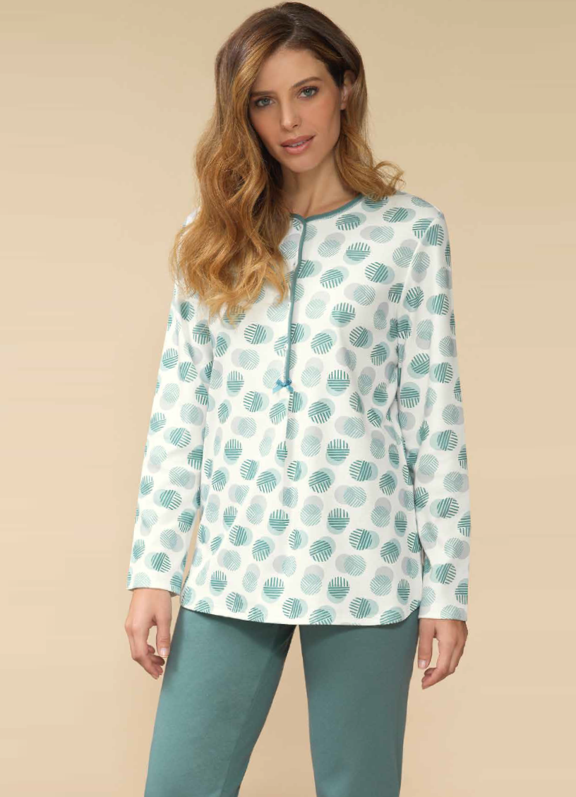 Pigiama realizzato in interlock di cotone, stampato per la maglia con scollo serafino ed unito per il pantalone lineare