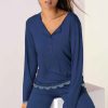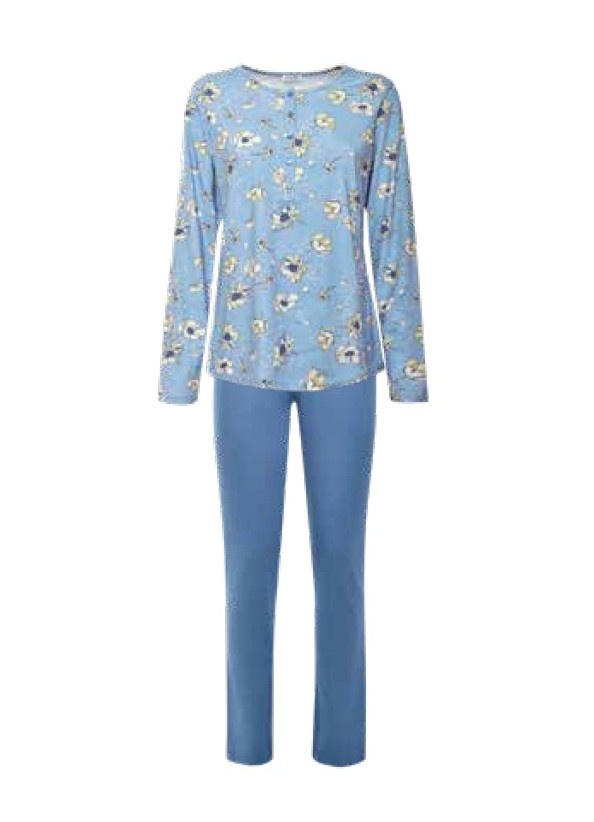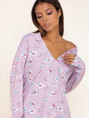 Pigiama lungo composto da maglia a fantasia con scollo serafino abbinata a pantalone lineare a tinta unita . In questo capo la primavera è un’immagine di vita, che passa veloce e lascia i petali del proprio eccezionale passaggio e dove i colori pastello si trasformano in un meraviglioso giardino fiorito.