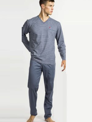 Pigiama lungo realizzato in cotone pettinato composto da maglia a fantasia con scollo a V e taschino , abbinata a pantalone lineare unito