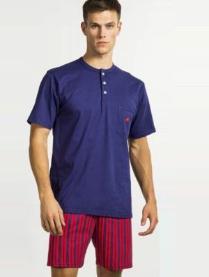 Pigiama corto realizzato in cotone composto da maglia a tinta unita con scollo serafino e taschino loggato, abbinata a pantalone a fantasia riga londra