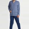 Pigiama calibrato lungo jacquard composto da maglia tinta unita con scollo serafino e taschino abbinata a pantalone con polsino