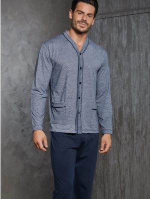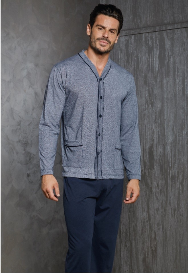 Pigiama jacquard lungo composto da maglia aperta con tasche abbinata a pantalone lineare