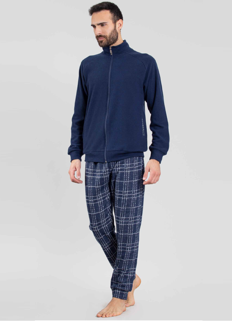 Pigiama realizzato a punto milano composto da mgalia full zip unita e pantalone a fantasia con polsino