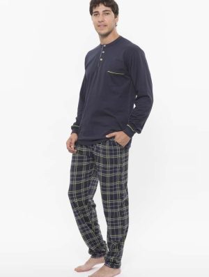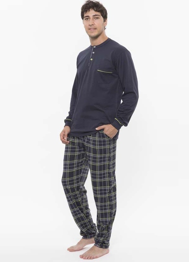 Pigiama lungo realizzato in jersey, unito per la maglia con scollo serafino e taschino, e a fantasia per il pantalone lineare
