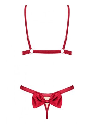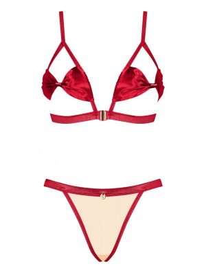 Set composto da reggiseno e perizoma allettanti realizzati in materiale satinato con spallacci delicati e regolabili: una garanzia che tutto si adatti perfettamente, coppe parzialmente aperte per enfatizzare perfettamente il seno, slacciamento situato tra i seni, fiocchi sensuali adornano busto e glutei, perizoma realizzato con una combinazione di tessuto nudo e raso rosso, ricchi ornamenti in metallo iin oro e un ciondolo sul perizoma. Materiale piacevole al tatto e flessibile