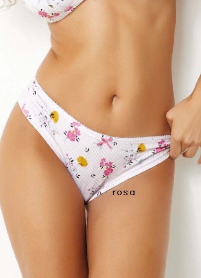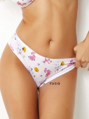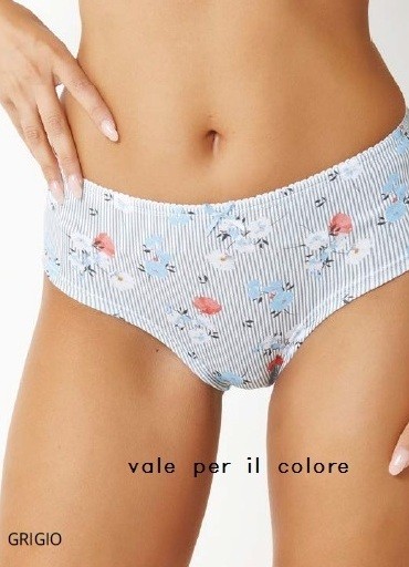 Slip stampato in tema floreale con delicati fiori fucsia e gialli a cui viene abbinato uno sfondo a righe rosa, bianchi e gialli su sfondo a righe blu, oppure fiori bianchi e rosa su sfondo a righe grigie