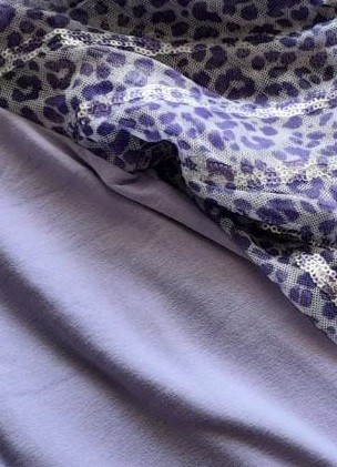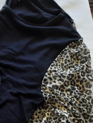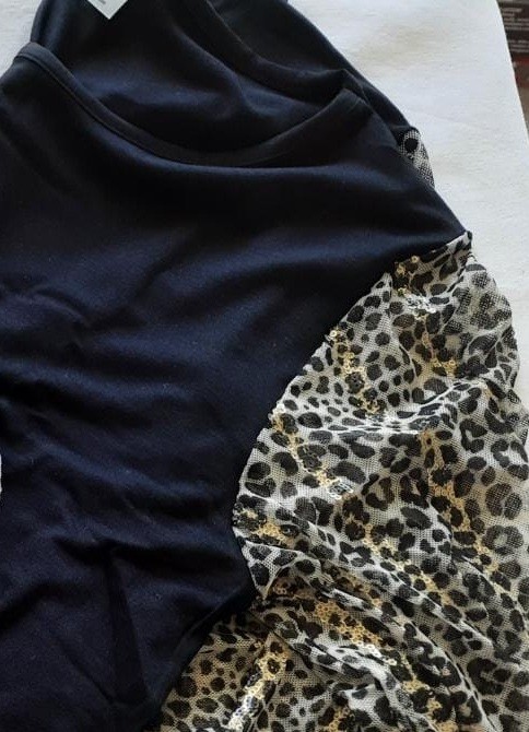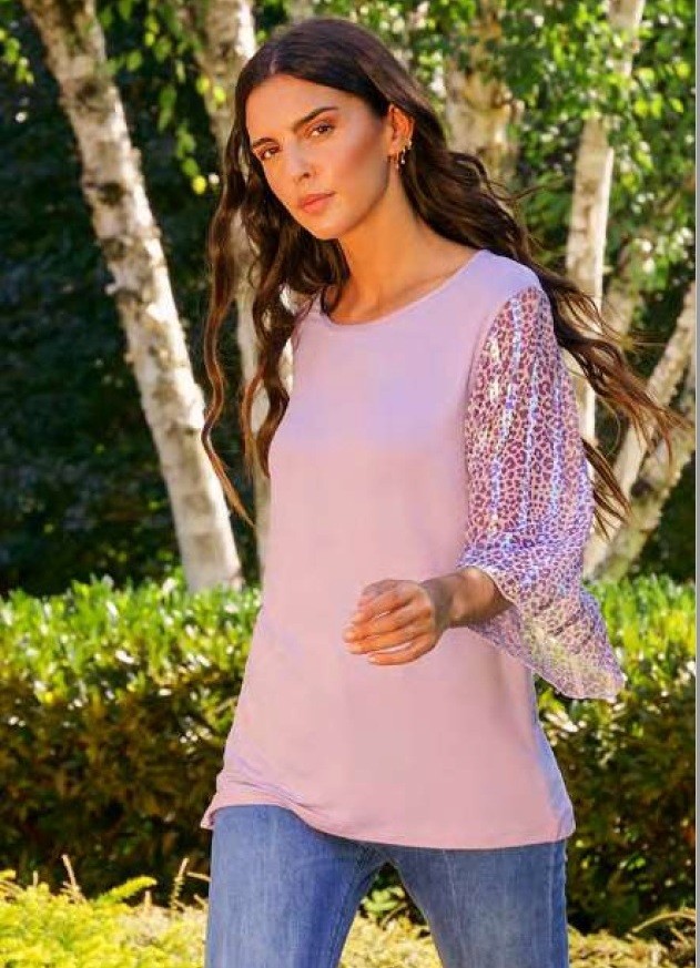 Maglia a girocollo realizzata in viscosa elasticizzata unita per il body e a fantasia per le maniche di tulle impreziosite da paiettes