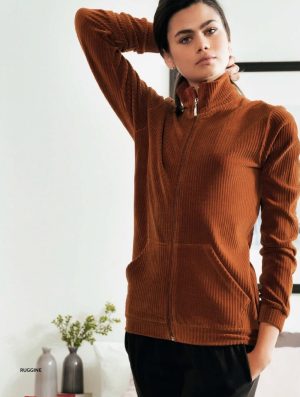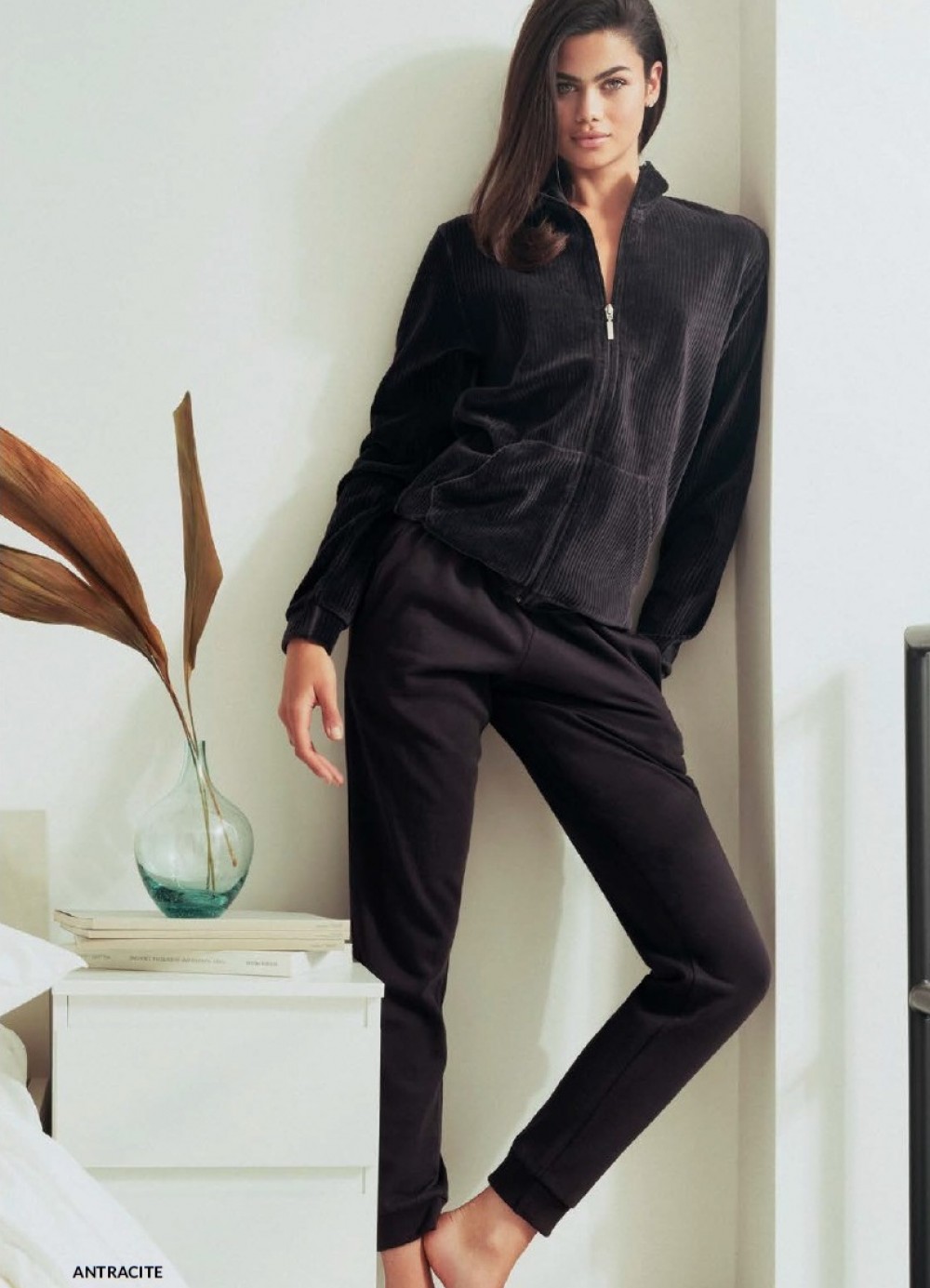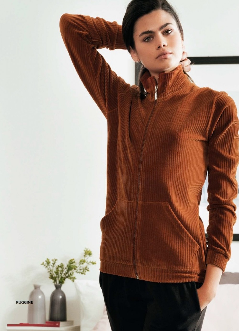 Tuta composta da una maglia aperta con zip in morbido tessuto di velluto a coste, tasca a marsupio e polsi al fondo manica, il pantalone in felpa di cotone ha tasche inserite nel fianchi e polso in costina al fondo.